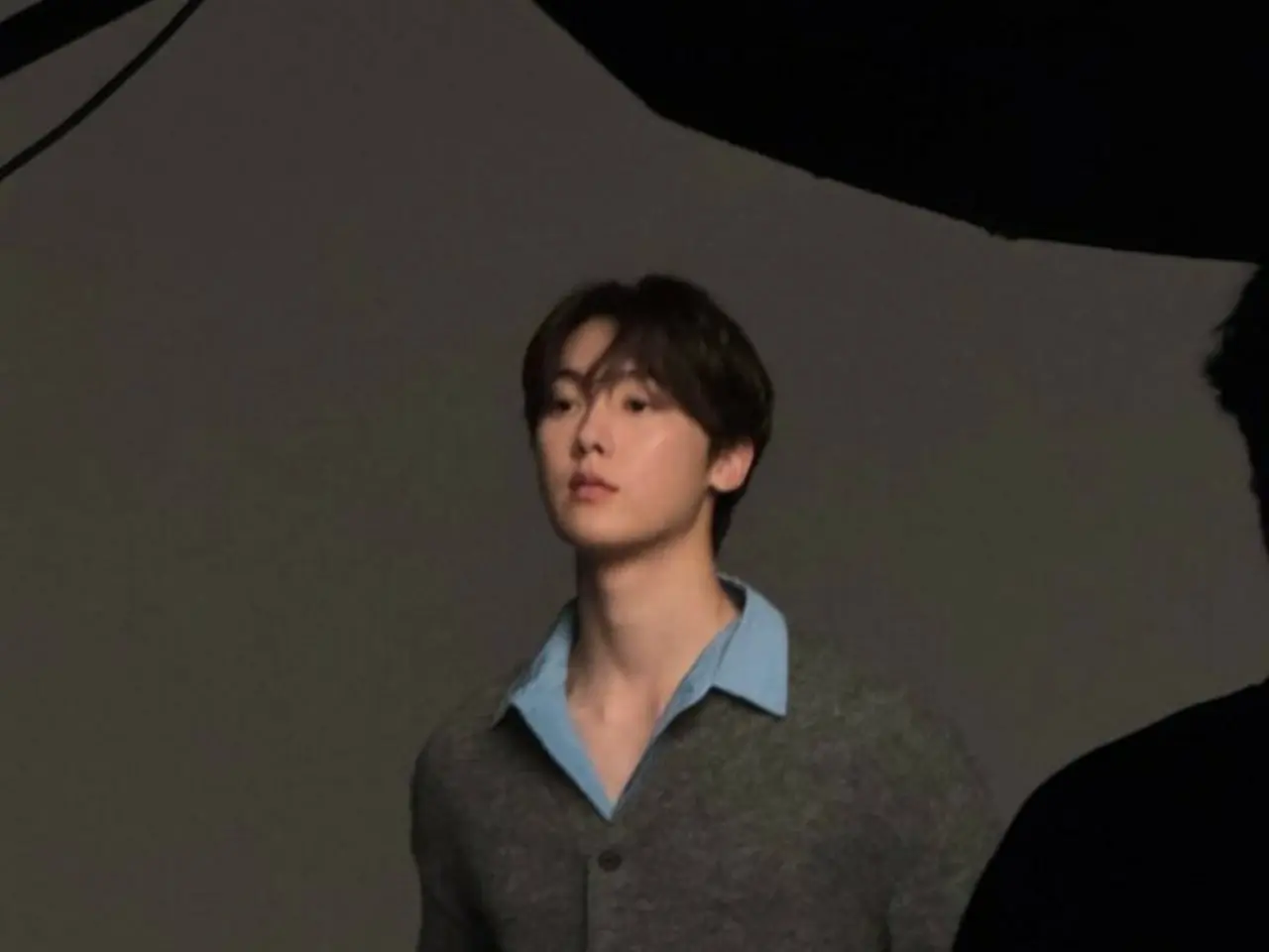 윤산하는 촬영세트에 서서 보는 사람을 설레게 합니다.
