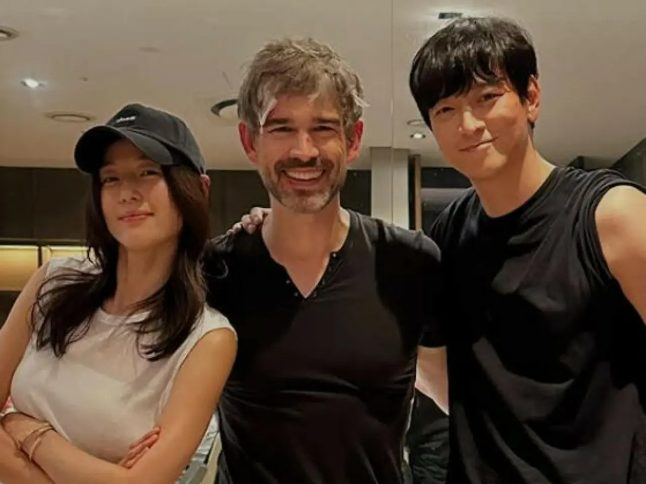 사진 속 정지영은 볼캡을 쓰고 팔을 짜고 밝은 미소로 카메라를 응시하고 있다. 강동우는 검은 티셔츠를 어깨까지 펴고 검은 빵
