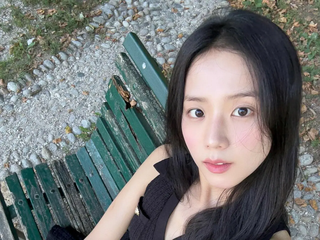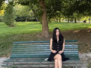 공개된 사진에는 검은 민소매 원피스와 블랙 SHOO를 매치한 모습으로 공원 벤치에 앉아 있는 사진, 그늘
