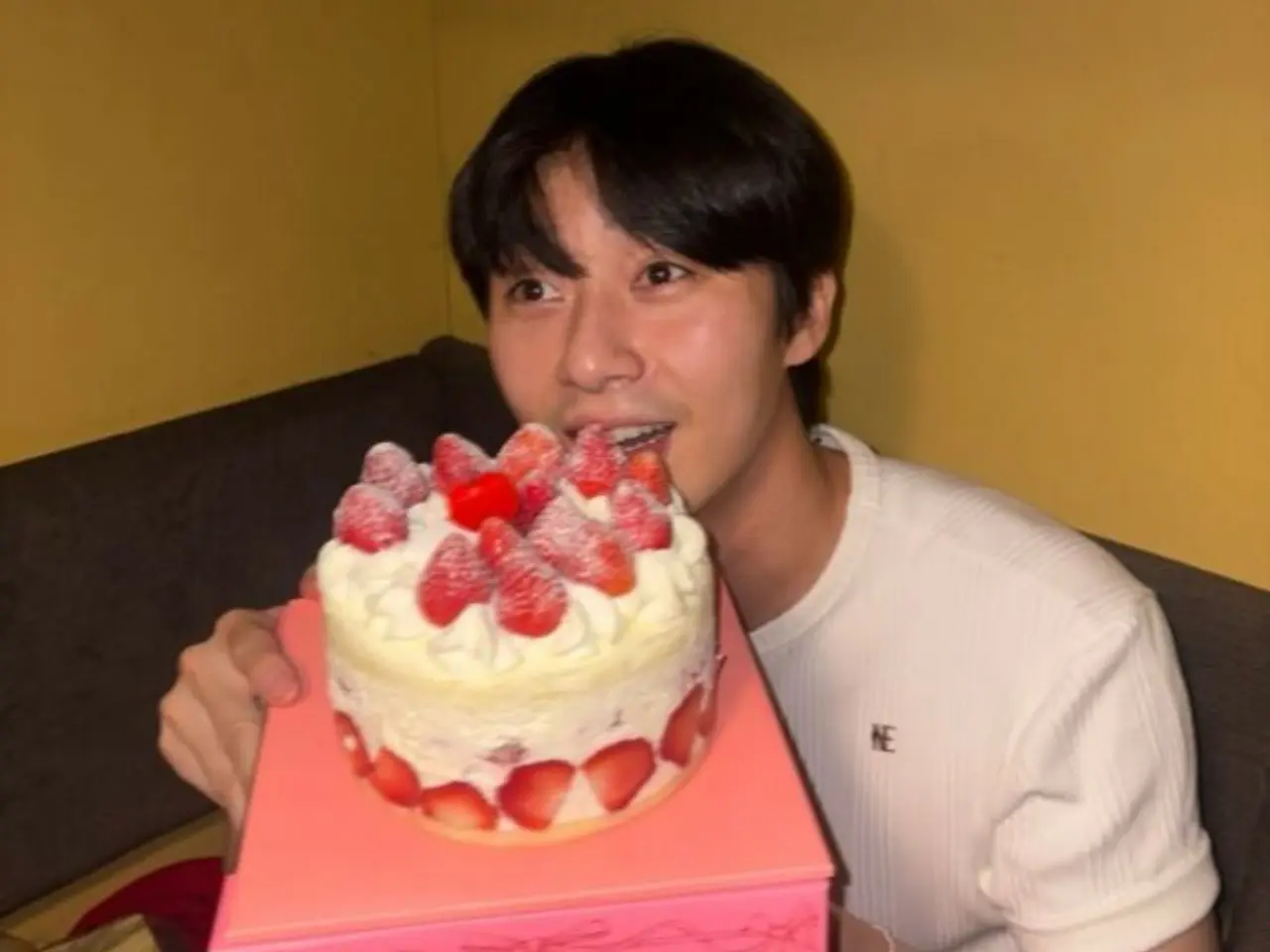 또한 그는 14 주년 축하에 선물 된 케이크, 풍선, 카페카 등과 함께 기념 사진을 찍었습니다.