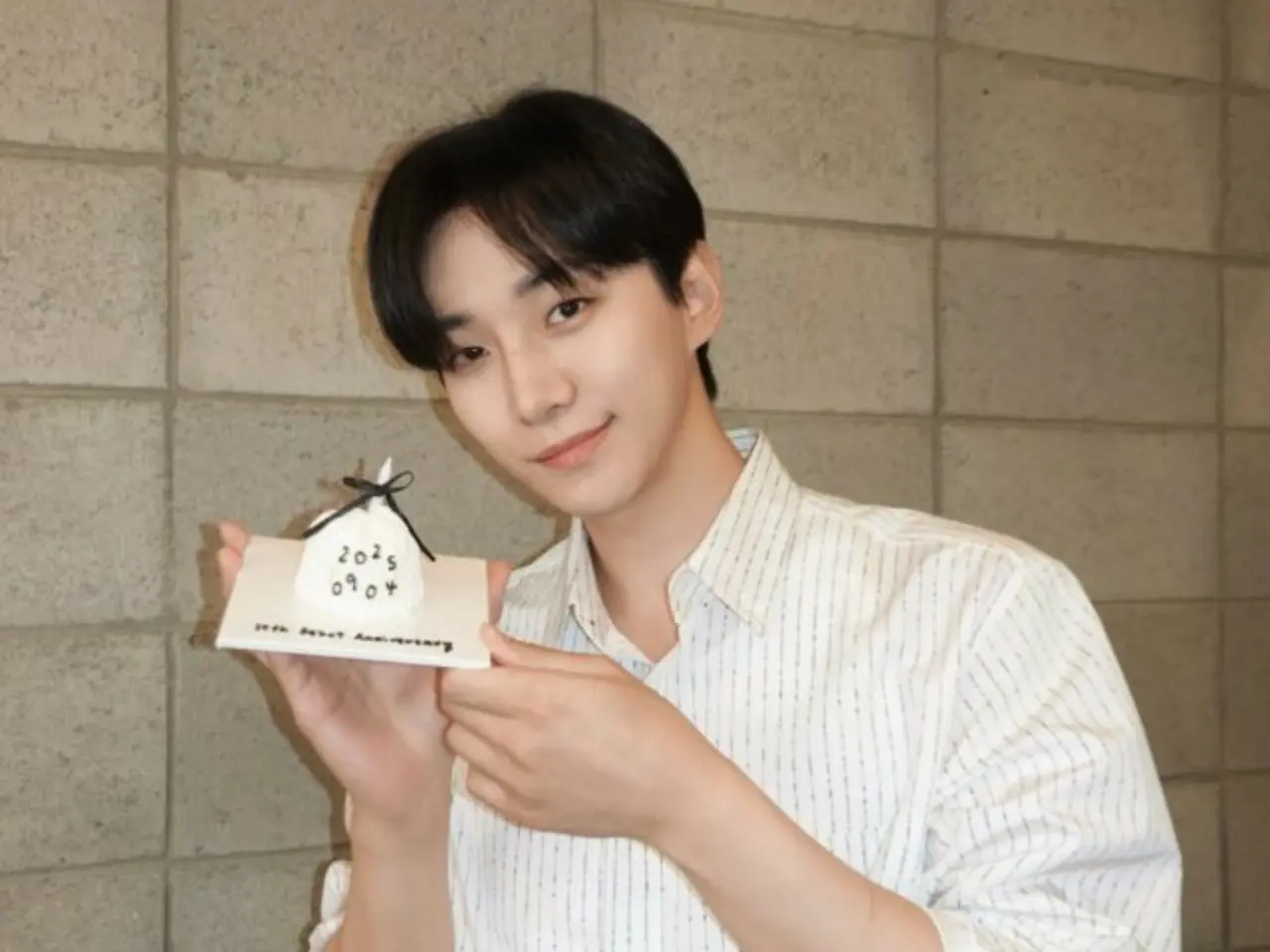 Anniversary'라고 적힌 작은 케이크를 가진 Junho의 모습이 담겨 있습니다. Junho는 화이트 테두리 셔츠를 입고 상쾌한 분위기를 자아냅니다.