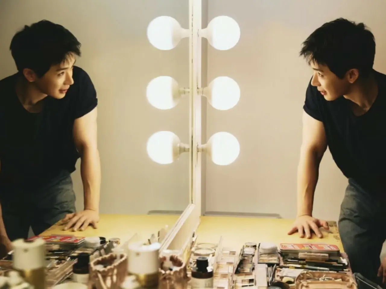 메이크업 룸에서 거울을 바라보는 WONHO 모습도 공개되었습니다. 미소와 함께